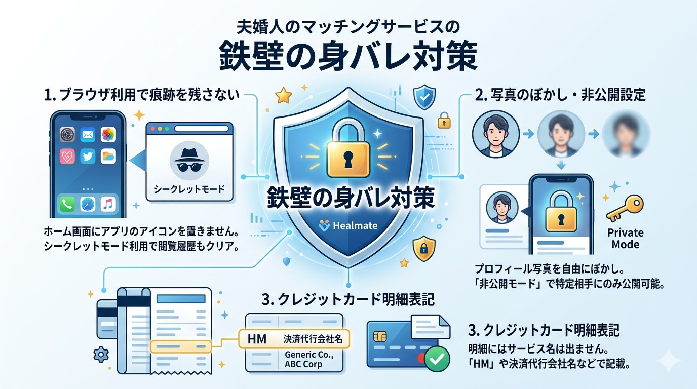 既婚者がマッチングサービスを利用する際、最も恐れるのが「身バレ」です。万が一、パートナーや知人に利用が発覚すれば、家庭崩壊や社会的信用の失墜につながりかねません。ここでは、ヒールメイトが実装している技術的なセキュリティと、ユーザー自身が実践すべき運用テクニックを解説します。